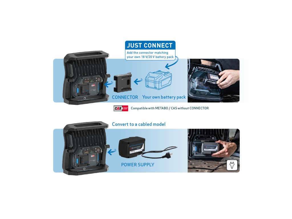 - Kompatibilné s 18 V/20 V akumulátormi od popredných značiek elektrického náradia pomocou SCANGRIP CONNECTOR.